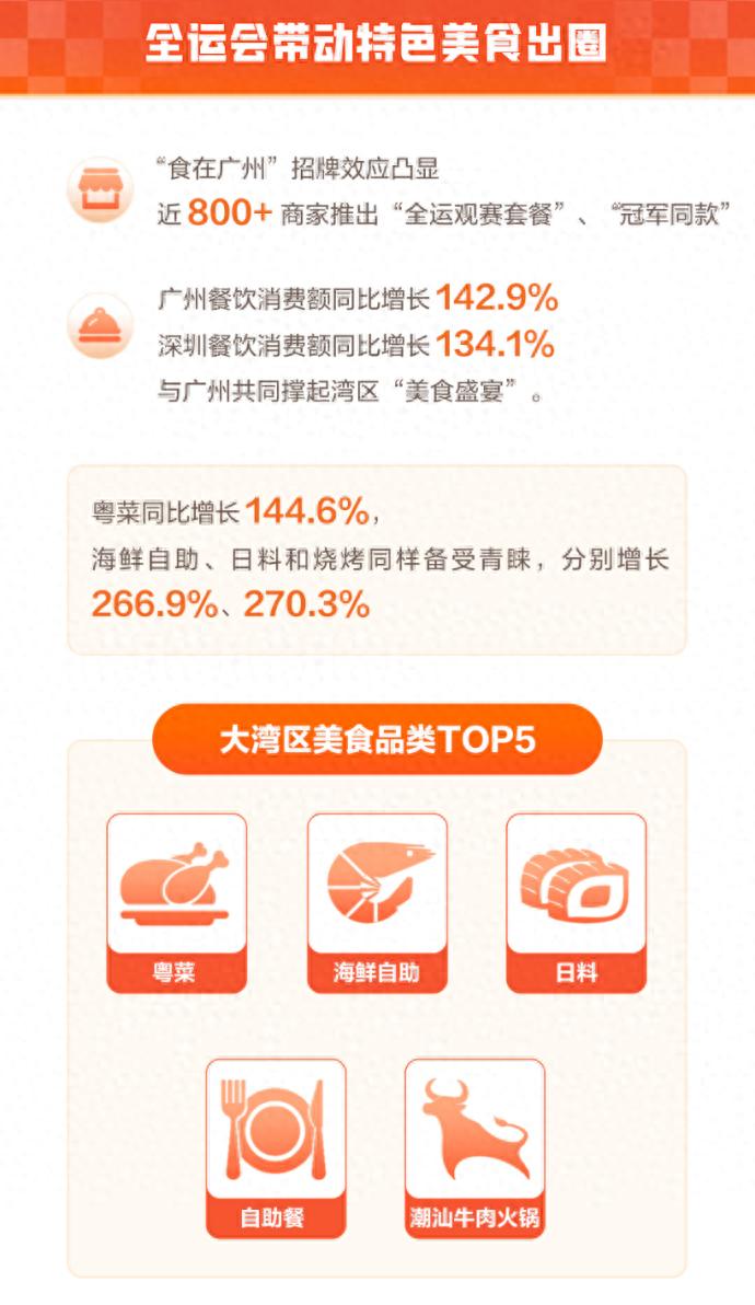 “食在广州”品牌效应在全运期间进一步凸显。近800家餐饮商家推出“全运观赛套餐”“冠军同款”等特色产品,带动餐饮消费显著提升。数据显示,广州餐饮消费额同比增长142.9%,深圳增长134.1%,共同推动湾区餐饮市场繁荣。其中,粤菜消费增长144.6%,成为比赛期间最受欢迎的餐饮品类,海鲜自助、日料和烧烤等品类增速均超过260%,同样受到消费者青睐。
