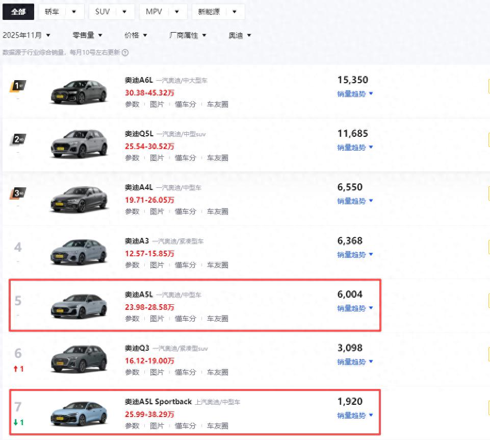 而且从最近公布的十一月份销量来看,一汽奥迪A5L和上汽奥迪A5L Sportback之间的销量差异越来越大,例如前者交付了6004台,后者仅仅交付了1920台。相比之下,一汽奥迪A5L销量更高的原因除了以上提到的之外,其实也跟该车拥有相对更低的门槛(起步价25.58万),以及一汽奥迪的经销商网络更广和用户对其的认知度更高有很大的关系。所以说了这么多,接下来不妨让我来跟大家聊聊这台一汽奥迪A5L,看看它的表现如何。