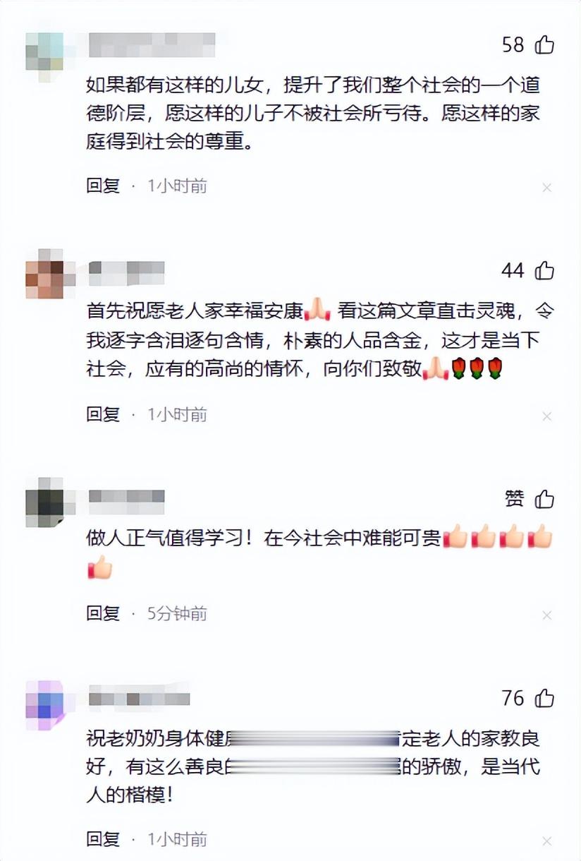 还有很多网友表示,自己被老人儿子的善良和正直深深打动,也被烈属家庭的坚守深深震撼,他们从这个普通的烈属家庭身上,看到了人性最本真的善良,看到了家风的力量,也看到了英雄精神的传承。