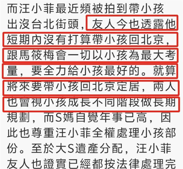大S去世后,曾有台媒报道称,汪小菲为了俩孩子着想,并不打算在短期内把俩孩子带回北京。