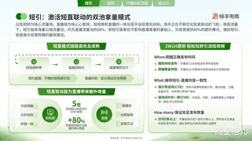 在快手电商高效且成熟的短直模式链路下,短直联动模式相比仅直播能够为商家带来80%的额外曝光增量,做好短引成为私域主播做大经营规模的最快路径。主播可以通过“2W1H”原则,即把握正确发布时间、保持短引-直播内容一致性和保证充足发布数量,轻松玩转短引,激活短直联动的双池拿量模式,实现流量爆发和经营跃迁。