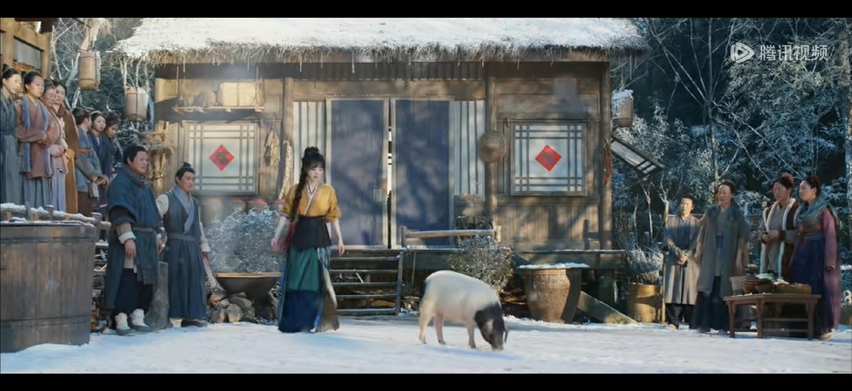 置景也十分粗糙:雪景像散落的纸屑,一眼就能看出是绿幕合成;樊长玉的肉铺干净得像样板间,毫无市井屠户的烟火气;就连剧中的猪,也温顺得像宠物,完全没有真实感。