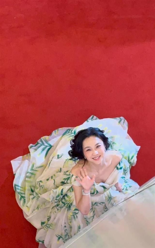红毯上的灯光打在她的裙子上,绿色与印花交织,仿佛一幅行走的油画。