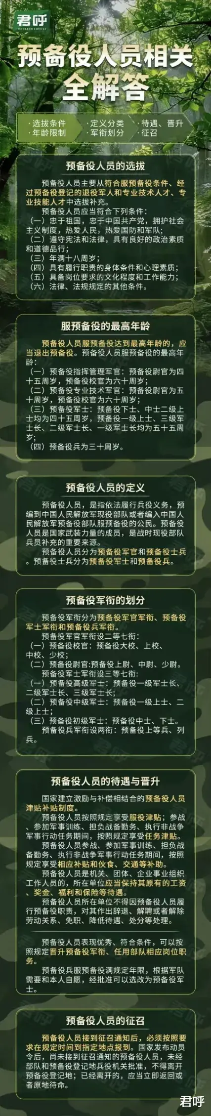 近期,也有许多战友通过君呼平台留言咨询,预备役人员的征召条件、授衔规定、福利待遇等热点问题。为切实回应大家的关切,君呼团队特意梳理了《中华人民共和国预备役人员法》中的核心条款,将针对这些高频疑问用下图进行集中解读。