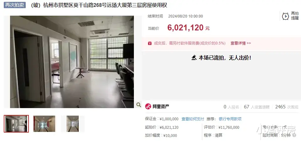 两宗学校资产走向拍卖,也是因为杭州桃源山庄房地产开发有限公司破产清算所致。而这宗打包资产,也不是第一次上架法拍平台了。阿里法拍显示,这次已经是第三次上架法拍了。前两次均因无人报名而流拍。相比首次上架的6044万元,这次已经降价了近2200万。但按照目前状况,买家还要额外支付约1480万装修费用以及税费、手续费,入手成本并不低。有意向且有实力拿下的单位也并不多,所以本次拍卖或将会有流拍可能。