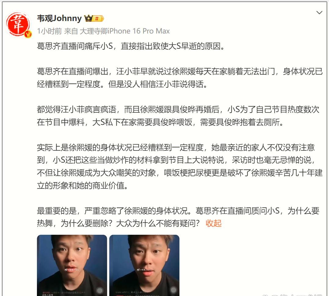 时间过得飞快,转眼间大S去世已经22天了。都说人死万事空,可大S去世后的一系列争端却不绝于耳。不止汪小菲和S家动作频频,还有“编外人员”陆续发声。2月23日,一直关注S家的资深狗仔葛斯齐忽然在直播中痛斥小S,并直指致大S早逝的原因,令网友大为意外。