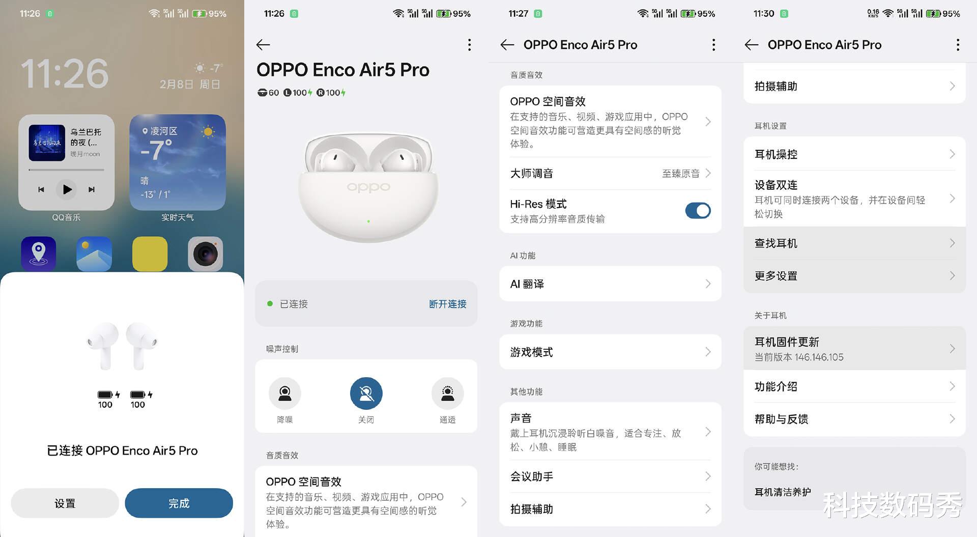 支持耳机弹窗,如果你用的是OPPO手机的话,直接在蓝牙连接界面下就能进入耳机设置界面,噪声控制、空间音效、大师调音、Hi-Res高品质传输模式、游戏模式都可以很方便的进行开启和调节。