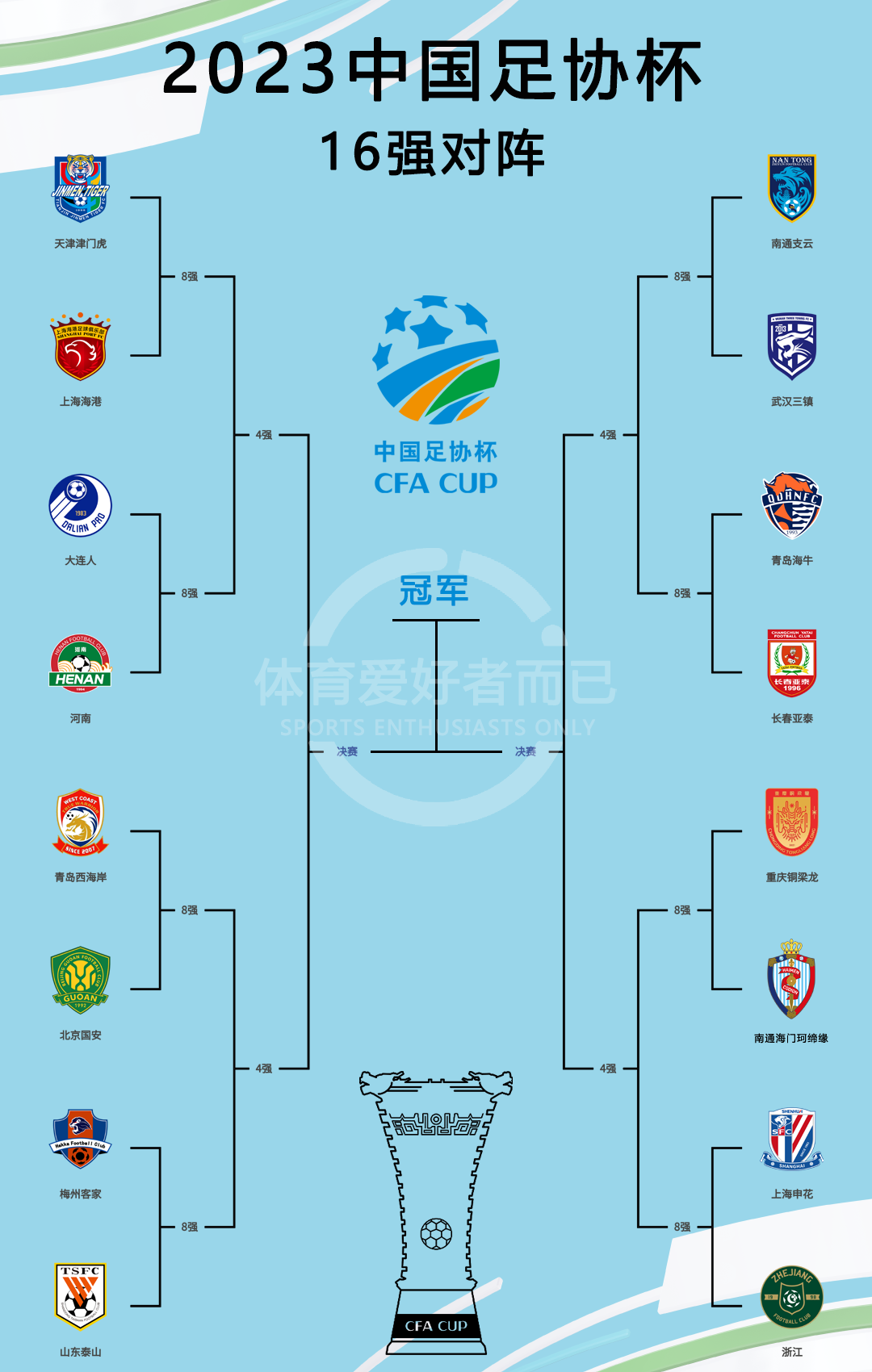 #图文新星计划 2023赛季中国足协杯第三轮比赛全部结束,足协杯16强对阵出炉,天津津门虎VS上海海港,大连人VS河南,青岛西海岸VS北京国安,梅州客家VS山东泰山,南通支云VS武汉三镇,青岛海牛VS长春亚泰,重庆铜梁龙VS南通海门珂缔缘,上海申花VS浙江,2023足协杯16强有13支超球队,1支中甲球队,2支中乙球队,2022足协杯冠军是山东泰山,2023足协杯你看好哪支球队最终夺得冠军呢? #足协杯16强出炉 #足协杯