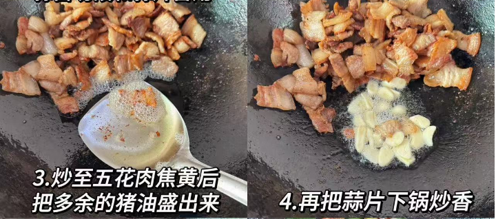 -盛出煸炒五花肉时逼出的油脂,然后往锅中放入蒜片和干辣椒段(今天因为有小孩要吃,所以没放辣椒),转中火翻炒出香味。
