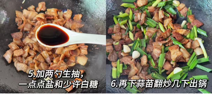 - 加入 2 勺生抽、少许盐和白糖,翻炒均匀,让五花肉上色和入味。白糖在这里起到提鲜的作用,能让整道菜的味道更加醇厚。