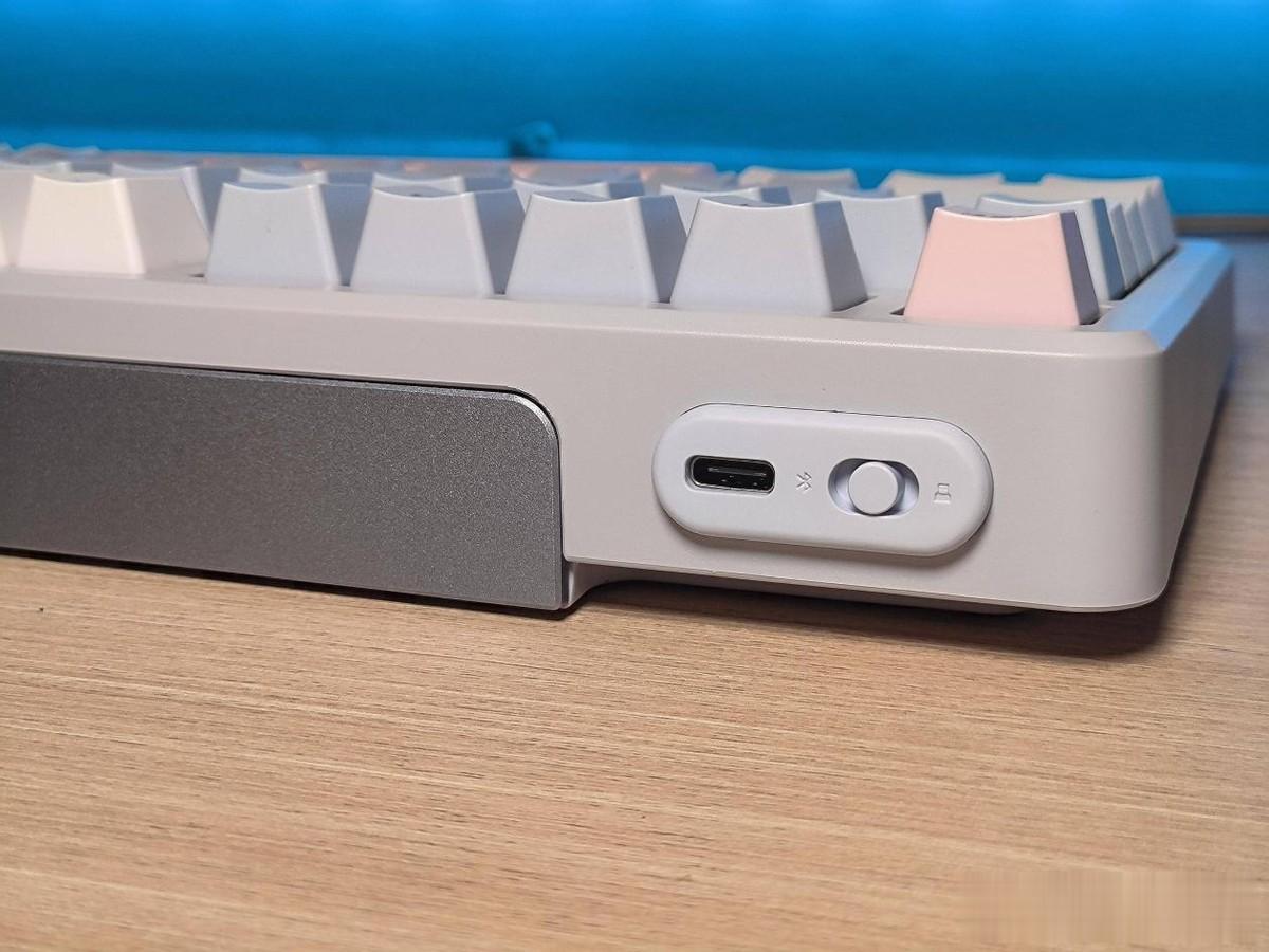 这个磁吸收纳仓除了收纳接收器以外,还做了特殊的灯光设计,可以自定义灯光颜色,还可以通过灯光来了解键盘的电池电量,非常巧妙的设计。