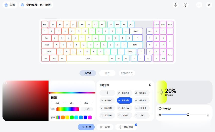 在A Hub驱动里,可以调整机械键盘各个位置的灯光效果亮度,也可以个性化改键,以及调整报告率等设置,整体自定义程度很高。