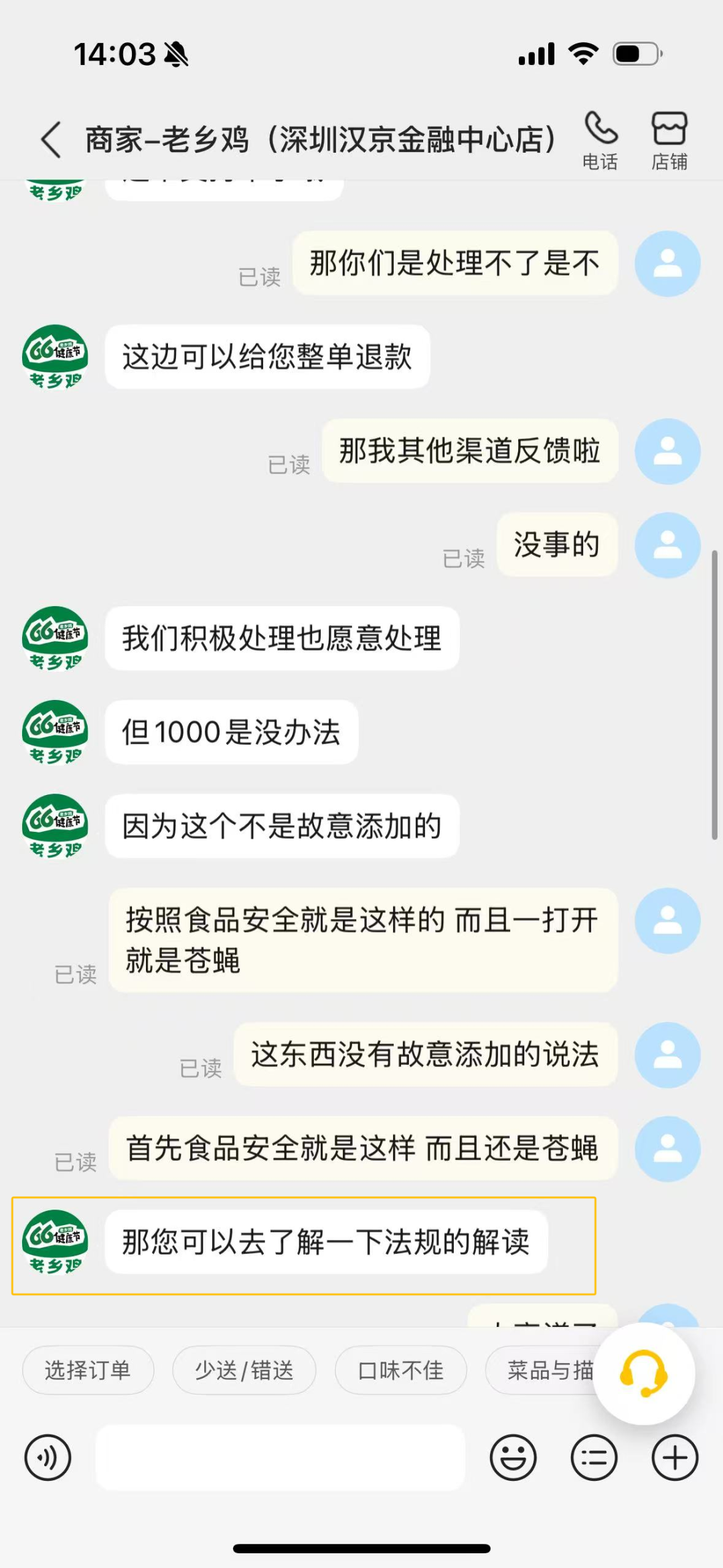 近期胡女士就遇到了糟心事,她通过外卖平台购买了一份价值28.5元的老乡鸡快餐,打开餐盒后竟发现食物上有一只黑色虫子。胡女士随即与门店工作人员取得联系,对方仅提供全额退款的处理方案,再无其他补偿 。