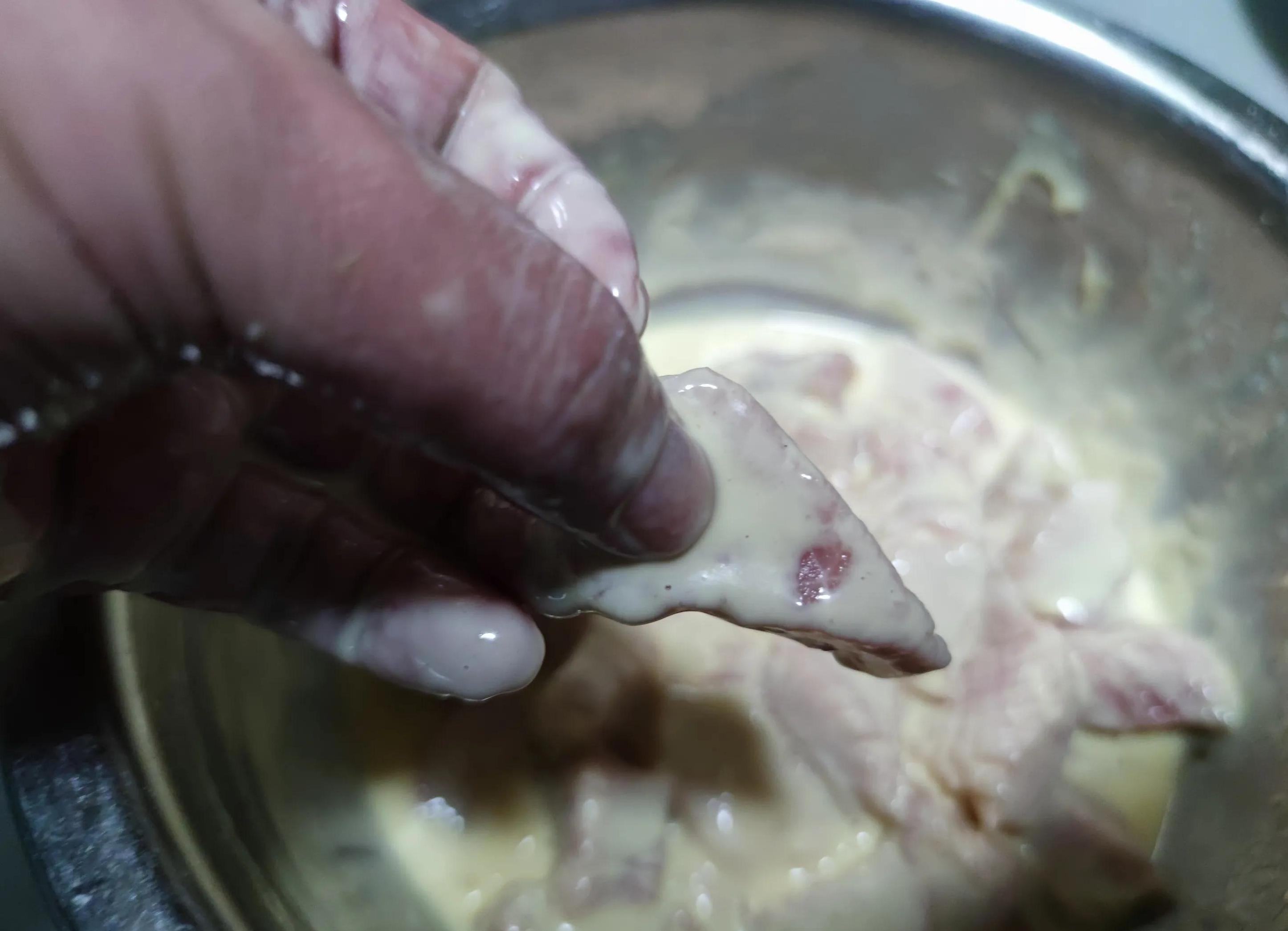 里脊肉去筋,切块腌制后裹上淀粉和面粉混合的糊。