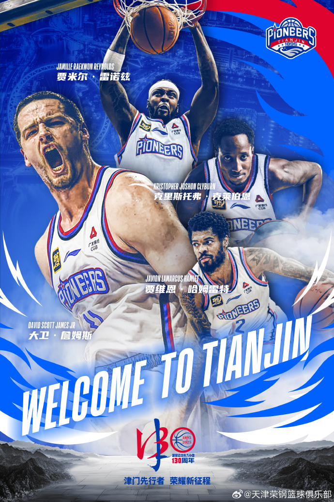 天津男篮:大卫-詹姆斯、贾米尔-雷诺兹、克里斯托弗-克莱伯恩。詹姆斯已经在天津打了三个赛季,另外两位是第一次来。
