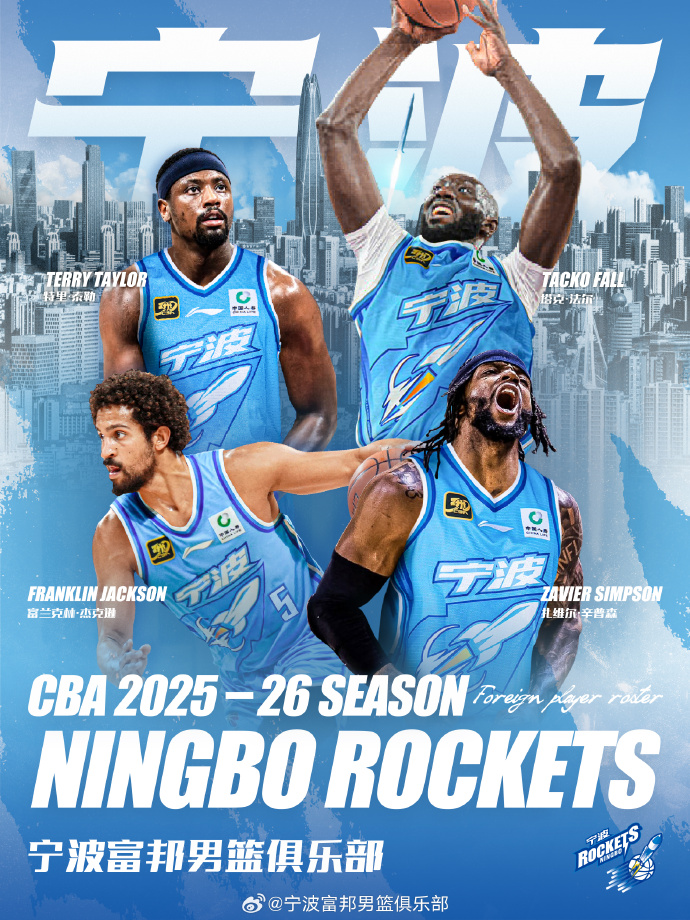 宁波男篮:特里-泰勒、扎维尔-辛普森、塔克-法尔、富兰克林-杰克逊。泰勒、法尔、杰克逊都在CBA打过,只有辛普森是第一次来。