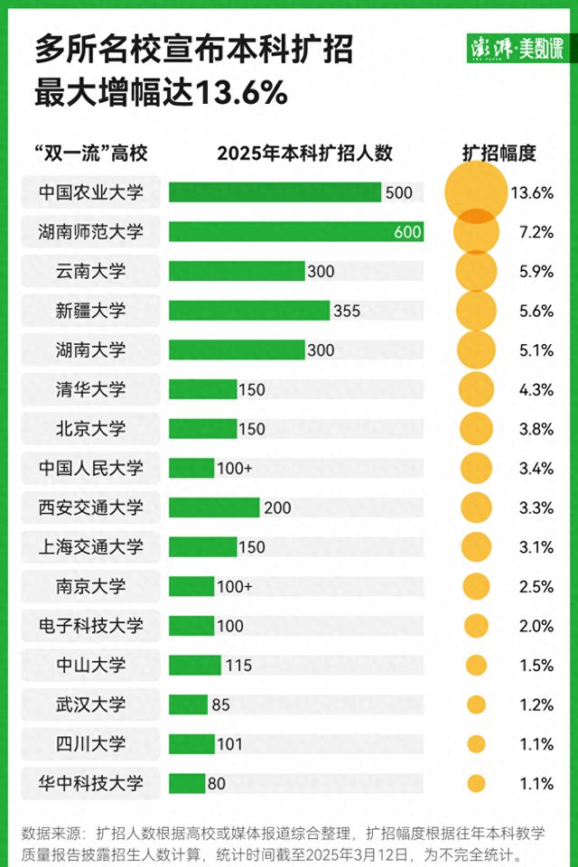 2025年注定是中国高等教育史上值得铭记的一年。各大名校争先恐后地宣布扩招计划,俨然一副“教育界春运”的热闹景象。从清华大学的150人,到中国农业大学一口气增加500人,再到武汉大学、南京大学、中山大学等顶尖高校纷纷加入扩招行列,仿佛一夜之间,高校扩招成了“顶流”趋势。这场教育盛宴背后,究竟是更多人圆梦名校的机会,还是一种更深层次的教育改革信号?今天我们就来好好唠一唠。