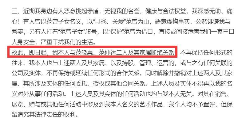 除此之外,范曾还宣布了一个重要决定,他将与女儿范晓蕙、继子范仲达断绝关系,不再有任何往来,也不允许对方以他的名义对外从事任何活动。