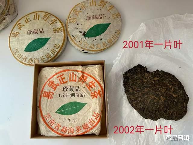 其中,2001年易武一片叶的叶子是全绿,叶脉不清晰;02年以后,绿叶上就特意突出了白色叶脉,一眼就能区分开。另外还有个小细节,02年只出了1个版面,剩下的01、03、04年各有2个版面,懂行的都靠这些细节辨年份。