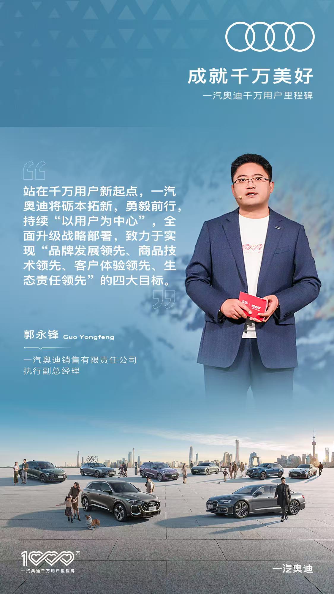 郭永锋在致辞中指出,一汽奥迪达成千万用户里程碑,是中国汽车工业发展的重大成就。这不仅是祖国强盛和人民生活水平提升的生动体现,更是千万用户对奥迪品牌信任与认可的结晶。自1988年进入中国市场以来,一汽奥迪始终坚持“合资而不依赖、引进更重创新”的理念,将产业报国精神融入血脉,以“以用户为中心”的基因深耕本土化发展。