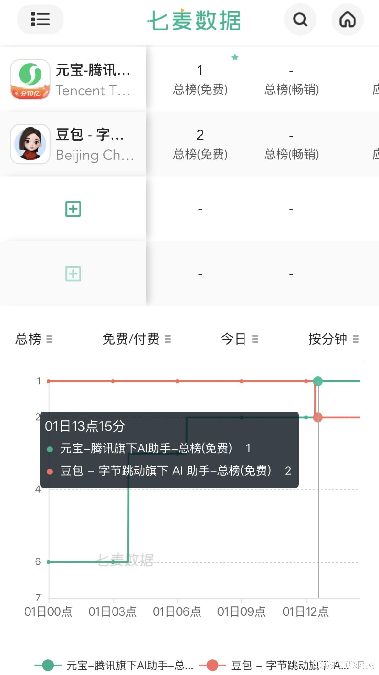 七麦数据显示,2026年2月1日下午1点15分,元宝App登上苹果应用商店App Store免费总榜单的第一名,字节跳动旗下的AI助手豆包被元宝反超。