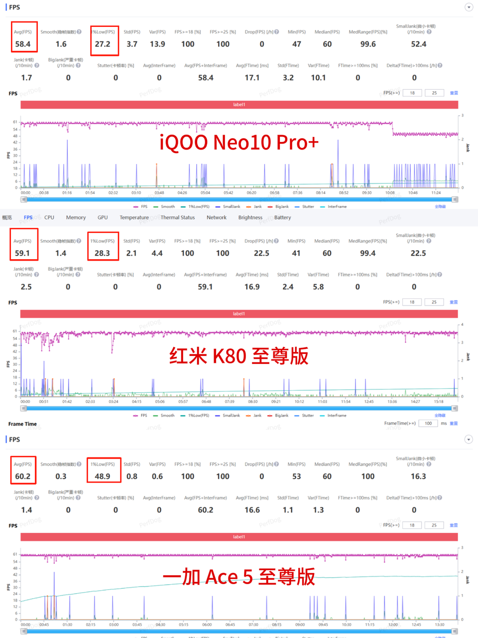而且我用一加Ace5至尊版玩的,这手机打游戏体验是真的好,听说这手机有什么电竞三芯、风驰游戏内核这些配置啥的,虽然不太懂,但玩起来是真的流畅!测试的时候,无卵放技能、跑图完全不卡,帧数稳得像直线,平均帧率都有60帧,游戏流畅关键的数据1% Low帧也有40多帧,就算是联机玩那个满屏都是色彩特效的"飞漆溅影"活动,照样丝滑得不行。