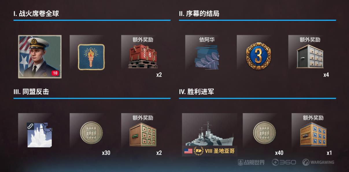 完成战役所有阶段,玩家还可以获得M系8级巡洋舰圣地亚哥,以及密苏里33%折扣券,凭借此券,可在军械库以更低价格购入M系9级战列舰密苏里及其永久涂装!