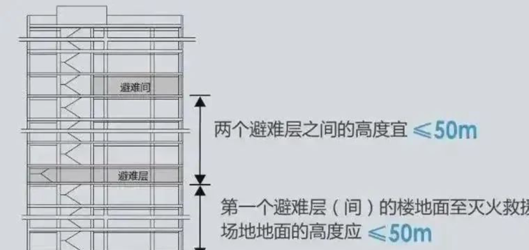 在高层建筑中,避难层一般以50米为间距,如果不能第一时间逃到一楼,特别是高层的人,那一定要第一时间去避难层躲避。