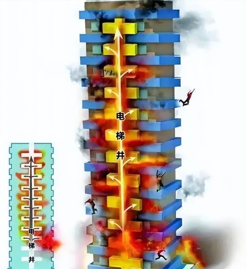 因为从下直通向上的通道,就像整栋大楼里的烟囱一样,在火灾发生的时候,周围的空气会迅速膨胀,热空气进入这些通道后,就会哗啦一下往上冲,然后顺带着火势也会哗啦一下往上冲,这也是高层建筑起火最害怕的“烟囱效应”。