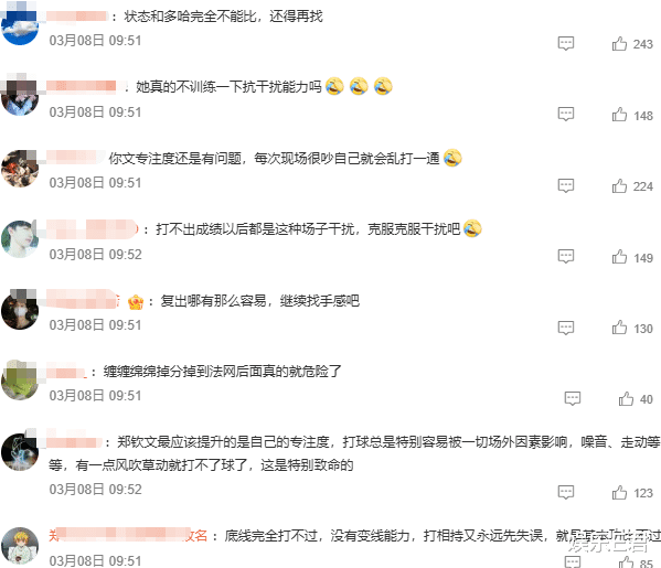 看到郑钦文的理由,很多网友也觉得无力反驳,认为她还是不在状态,基本功比不过对方,主要还是她自身原因,但愿她后续的比赛能有好成绩。