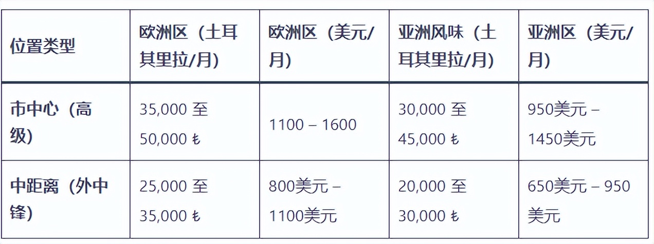 注:美元等值金额基于较为保守的预测汇率,以便更好地进行预算。租金几乎总是以土耳其里拉(₺)支付。