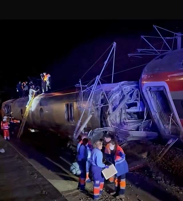 事故现场令人触目惊心:车厢如被巨力揉捏的纸盒,车窗玻璃化为满地星辰,旅客行李散落四处。救援车辆的警示灯光划破夜空,消防员用液压器械撑开变形的车门,医护人员跪在碎石间实施急救,直升机轰鸣着将重伤者转运至附近医院。