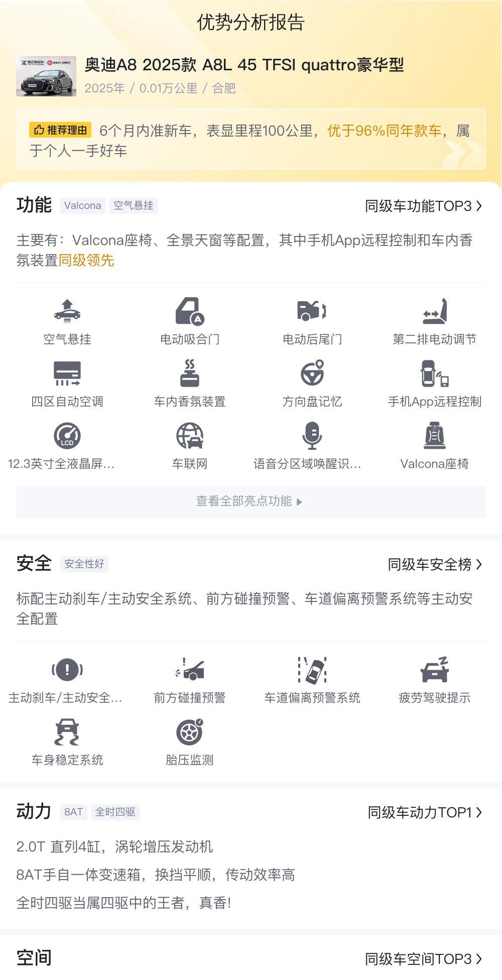先抛开品牌光环,回归到汽车的本质。一辆车,最重要的无非是三大件:发动机、变速箱和底盘。而A8L在这方面,即使是二手车,也依然有着不俗的实力。以我们今天讨论的这辆2025款 A8L 45 TFSI quattro豪华型为例,它搭载的是一台2.0T涡轮增压发动机,匹配8AT手自一体变速箱和quattro全时四驱系统。这套动力组合,最大功率265马力,最大扭矩370牛·米,动力储备充沛,无论是城市代步还是高速巡航,都能提供游刃有余的驾驶体验。quattro全时四驱系统,则进一步提升了车辆的操控性和稳定性,尤其是在雨雪天气或复杂路况下,更能体现其价值。当然,对于一辆豪华轿车而言,舒适性同样至关重要。A8L的座椅、悬挂调校都偏向舒适,配合宽敞的车内空间,即使长途驾驶也不会感到疲惫。