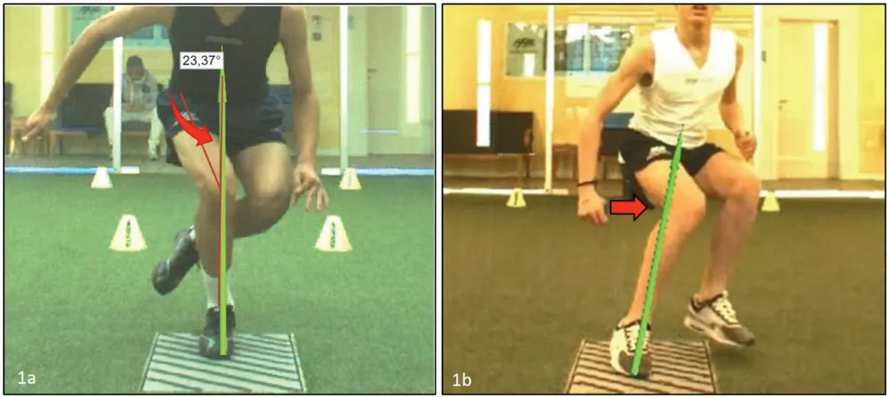 图中两名年轻男性运动员在跳跃和减速任务中,股骨内旋和内收(1a)以及膝关节内侧偏移(1b)可能表明臀肌功能不足。