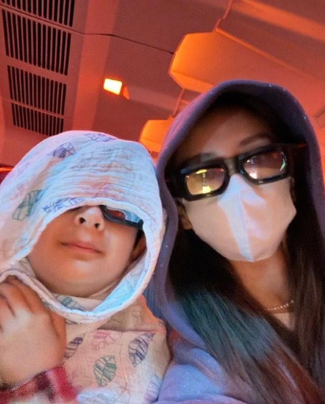 在这组照片里,第一张照片就是她自己与儿子小海绵的合照。