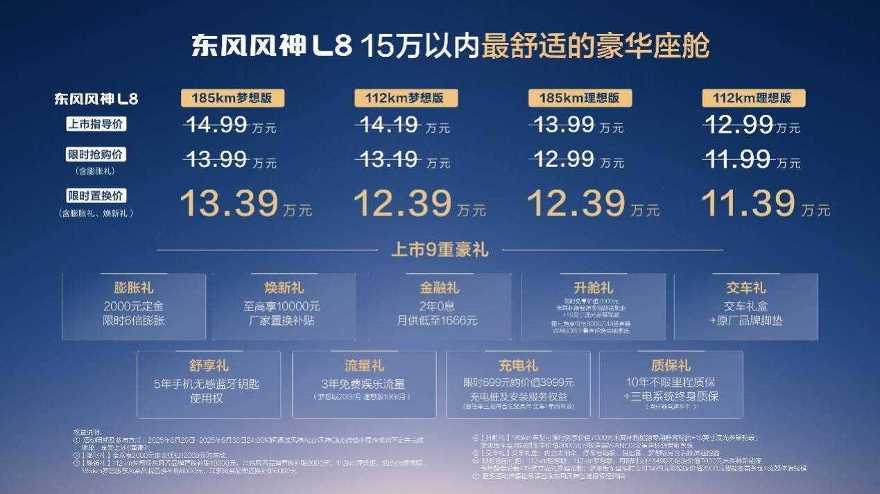 8月29日,在第28届成都车展上,东风新旗舰东风风神L8正式宣布上市,限时置换价仅需11.39万元起(可叠加享受国/地补),直接击穿“25万元才能配齐冰箱彩电大沙发”的行业认知,成为这个级别最具竞争力的舒享座舱之王。