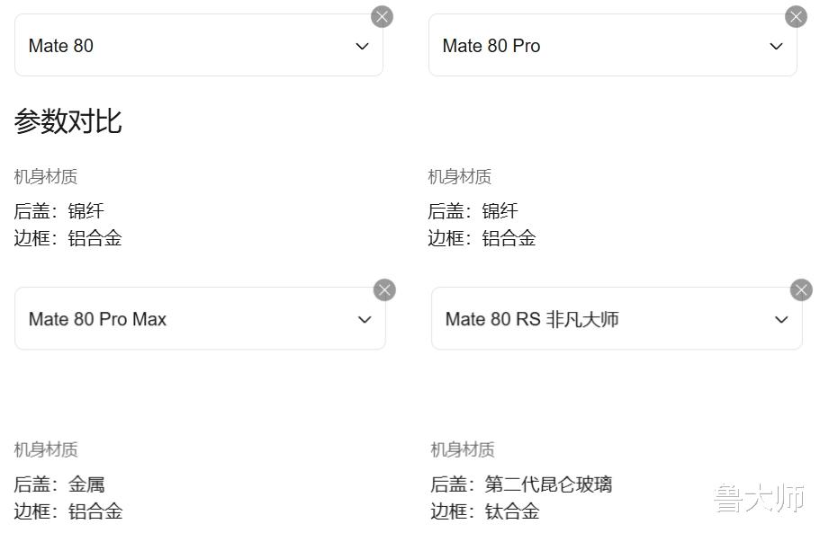 鲁Sir按照手机由外到内开始说起。首先外观材质上,可能大家在发布前根据官图看出Mate80 Pro Max后盖是金属材质,而且除开RS版的另外3款机型外观设计大差不差。