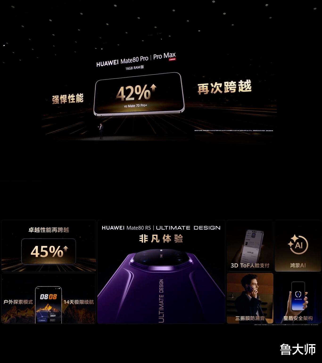 而均搭载麒麟9030 Pro的Mate80 Pro、Pro Max和RS版,性能相较于上代Mate 70 Pro+/RS则是分别提升了42%、42%以及45%,一通理下来,差点儿给鲁Sir我绕晕了。。。