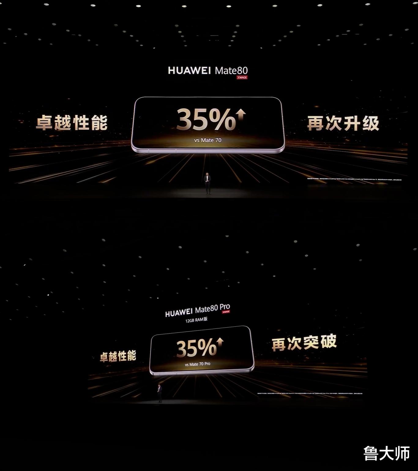 关于各机型的性能提升,搭载麒麟9020的Mate80标准版和9030的Pro版,相比上代Mate70标准版、Pro版,整机性能均提升了35%。