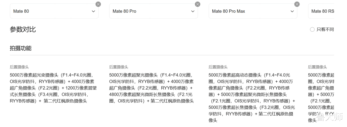 影像部分,要说什么细节的话,那就是Pro Max和RS版后置均是5颗摄像头,影像规格保持了一致,且含有双长焦,全镜头均为RYYB传感器;标准版和Pro版为后置4摄,且标准版的长焦参数还要差一些,Pro版长焦又不是RYYB传感器。然后Mate80全系这次也标配第二代红枫原色镜头。