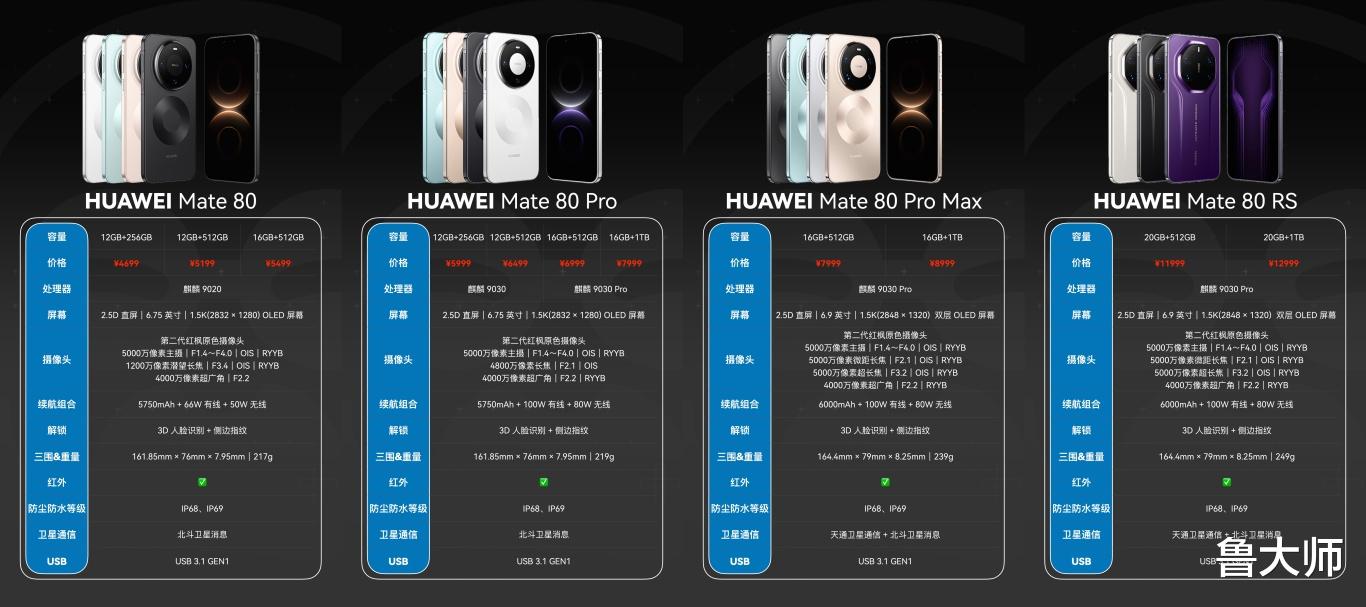 而发布会嘛,对手机的介绍一般都相对笼统,各款机型的配置差异也不够详细,不少朋友可能也看得云里雾里的,因此鲁Sir特地去官网逐行看了看华为Mate80全系的详细配置参数,准备替各位盘一盘,华为Mate80系列那些你可能不知道的“细节”。