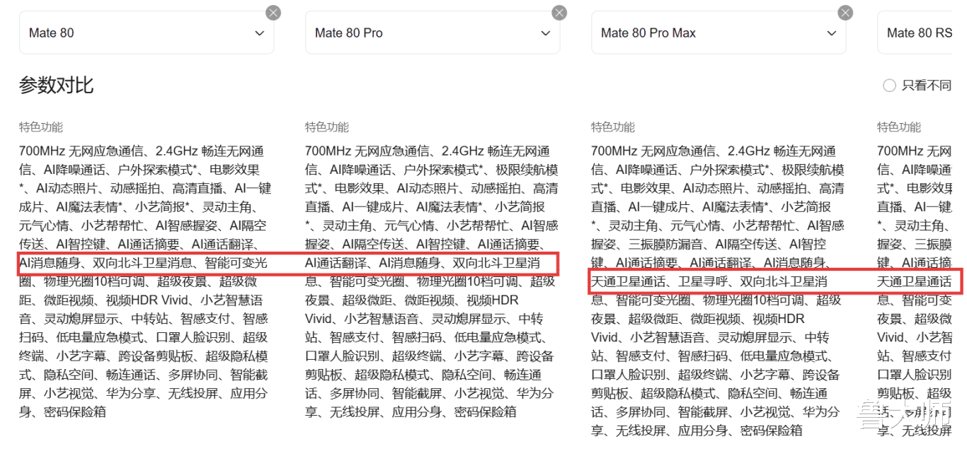 至于卫星通信这块,Mate80系列保持了和上代一致的规格,仅Pro Max、RS版支持北斗卫星消息+天通卫星通话;而标准版、Pro版仅有北斗卫星消息。