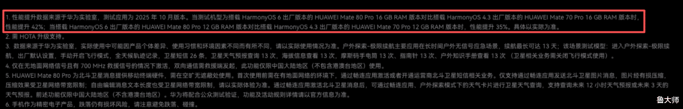 性能提升这儿也有个细节,Mate80系列对比的上代Mate70系列,后者是处于出厂预装鸿蒙4.3系统环境,而前者Mate80全系预装的鸿蒙6,侧面说明鸿蒙6在软件层面也有不小的功劳。