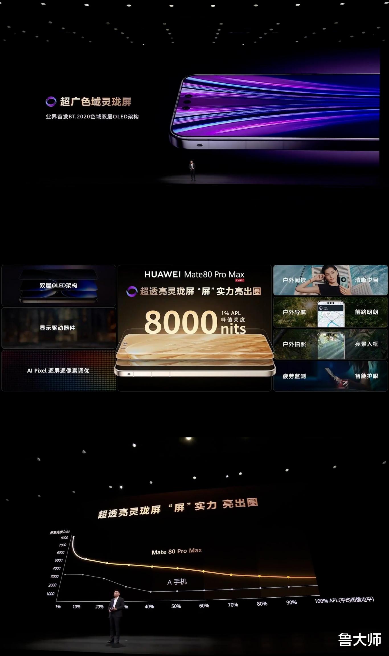 至于不少人关注的双层OLED屏幕,上代Mate70系列是RS版独占,这次算是下放到了Pro Max身上,1%窗口下的局部峰值亮度,官方数据明确能拉到8000nit,而全局峰值,根据发布会信息,大概在2000nit左右,的确称得上亮。