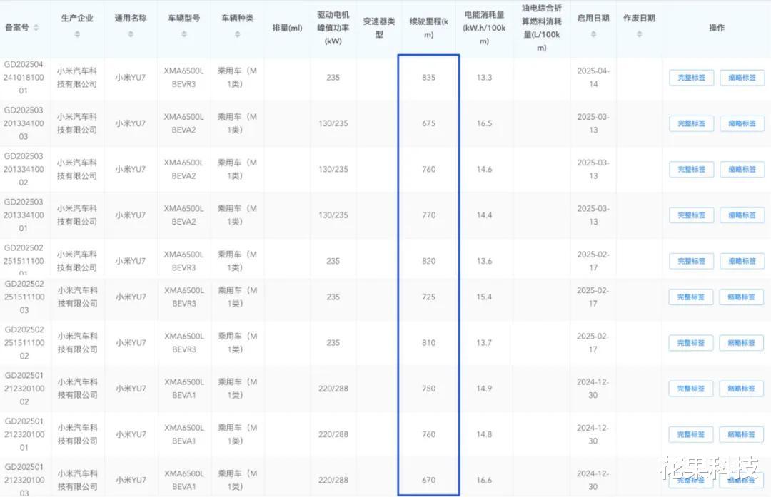 现在小米 YU7 各个版本的续航也已经在工信部公示了,三个版本一共有十种不同的 CLTC 续航里程。