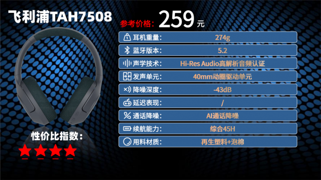 2026性价比最高的头戴式耳机是哪款?这款耳机从续航与功能来看,飞利浦TAH7508的60小时超长续航(关降噪)是其突出优势,配合快充技术(15分钟充3小时),应对长途出行无压力。音质上,40mm发声单元与专业声学调校带来了均衡的三频表现,低频强劲而不轰头,人声位置适中,但高频细节解析力与同类支持高清编码的耳机相比略有差距。其主动降噪系统(-43dB)能有效隔绝环境噪音,并支持多档降噪模式切换,不过通透模式的自然度一般,对话时需适当调低音量。连接方面,蓝牙5.2与多点连接提升了多任务效率,但机身重量约274克,长时间佩戴后头梁调节处可能产生轻微松动感。耳机保留3.5mm有线接口并支持折叠收纳,但转轴结构的耐用性有待时间检验。