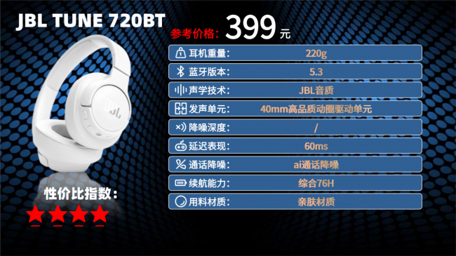 2026性价比最高的头戴式耳机是哪款?这款耳机蓝牙5.3确保连接稳定与低功耗;220g轻量化设计配合柔软耳罩,适合长时间佩戴。音质层面依赖40mm动圈与JBL Pure Bass调音,中低频饱满扎实,但高频延展性与编码格式(仅SBC/AAC)较为基础。超长续航是其主要优势,单次充电支持76小时播放,快充技术(5分钟用3小时)有效缓解电量焦虑。接口方面配备USB-C与3.5mm有线接口,结合可折叠设计,兼顾便携性与灵活性。不足之处在于未搭载主动降噪功能,且物理按键的操作方式略显传统。