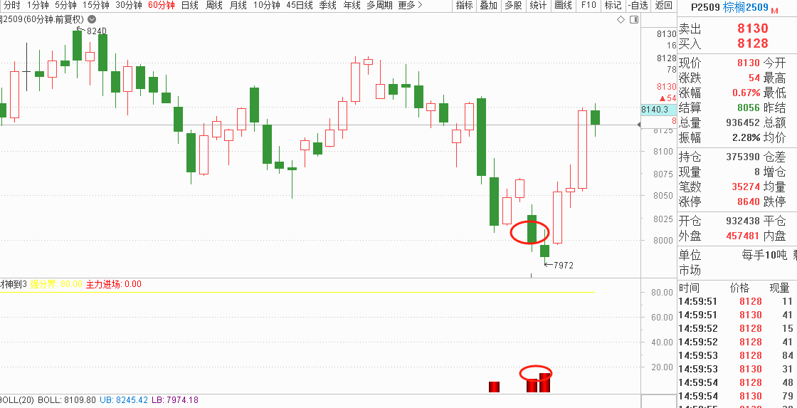 豆粕豆油菜油还在继续拉,就不展示了,之前一直讲的品种。今天螺纹出现60分钟红柱,目前没有阳线,但注意焦煤继续新低,没稳定前螺纹风险还是有的。棕榈如期按照规律性向上。尿素上午发的看好,中午下午起来,目前日线图红柱加阳线。棉花目前有60分红柱,但无阳线。有人说玻璃也有红柱,我为什么不发?问这句话的对指标的理解还不够,可以多多交流。欢迎点赞关注,欢迎长期跟踪验证。