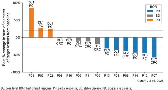 靶向KRAS G12V突变的NW-301V疗法,在14例无有效治疗选择的晚期结直肠癌、胰腺癌患者中,总体客观缓解率达42.9%,疾病控制率(DCR)达78.6%。在接受中、高剂量组治疗的10例受试者中,部分缓解率和病情稳定率均为50%。
