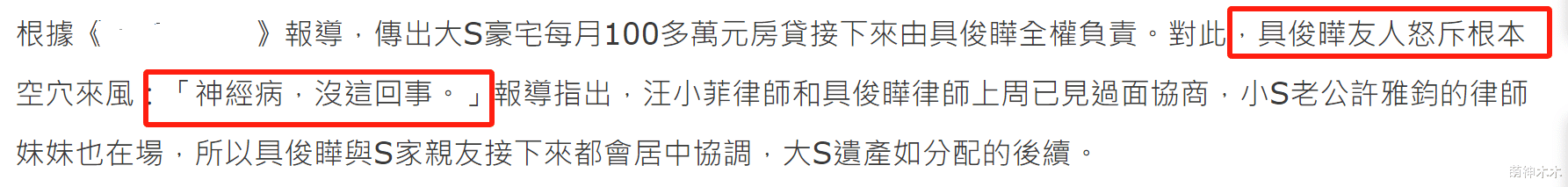 而这个问题同样是具俊晔、S家、汪小菲等人商讨的重点,台媒传出具俊晔是继承人中唯一的成年人,所以房贷由他全权负责,但具俊晔似乎并不想负责。